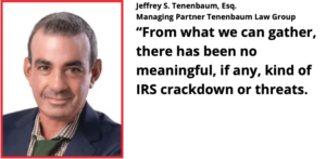 The shifting of enforcement duties from the IRS to the Department of Justice is important. “I know exactly what’s involved in litigation, and I know exactly what’s involved in an IRS audit and appeal. The two share virtually no similarity,” said Jeffrey S. Tenenbaum, managing partner at Tenenbaum Law Group, a Washington, D.C.-based firm that primarily serves as outside general counsel for nonprofit organizations and related entities.